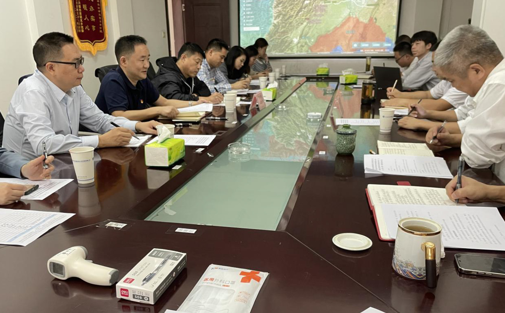 在測繪分院,測繪分院黨支部的專業(yè)技術(shù)人員向大家介紹了各類新型測繪工具的種類、性能、應(yīng)用范圍及運(yùn)用前景,詳細(xì)介紹了引大濟(jì)岷項目工程前期測繪工作開展情況。組織觀看了測繪分院及相關(guān)前期項目工程短片。在“大討論、大調(diào)研、大服務(wù)”座談會上,兩個支部的黨員進(jìn)行了深入的交流。雙方支部書記分別介紹各自支部基本情況,隨后兩支部黨員以“決戰(zhàn)四季度、大戰(zhàn)100天,全面完成年度目標(biāo)任務(wù)”為主題,結(jié)合集團(tuán)主責(zé)主業(yè),就如何強(qiáng)化黨建與生產(chǎn)經(jīng)營深度融合,充分發(fā)揮基層支部和一線黨員先鋒模范作用進(jìn)行了深入討論。